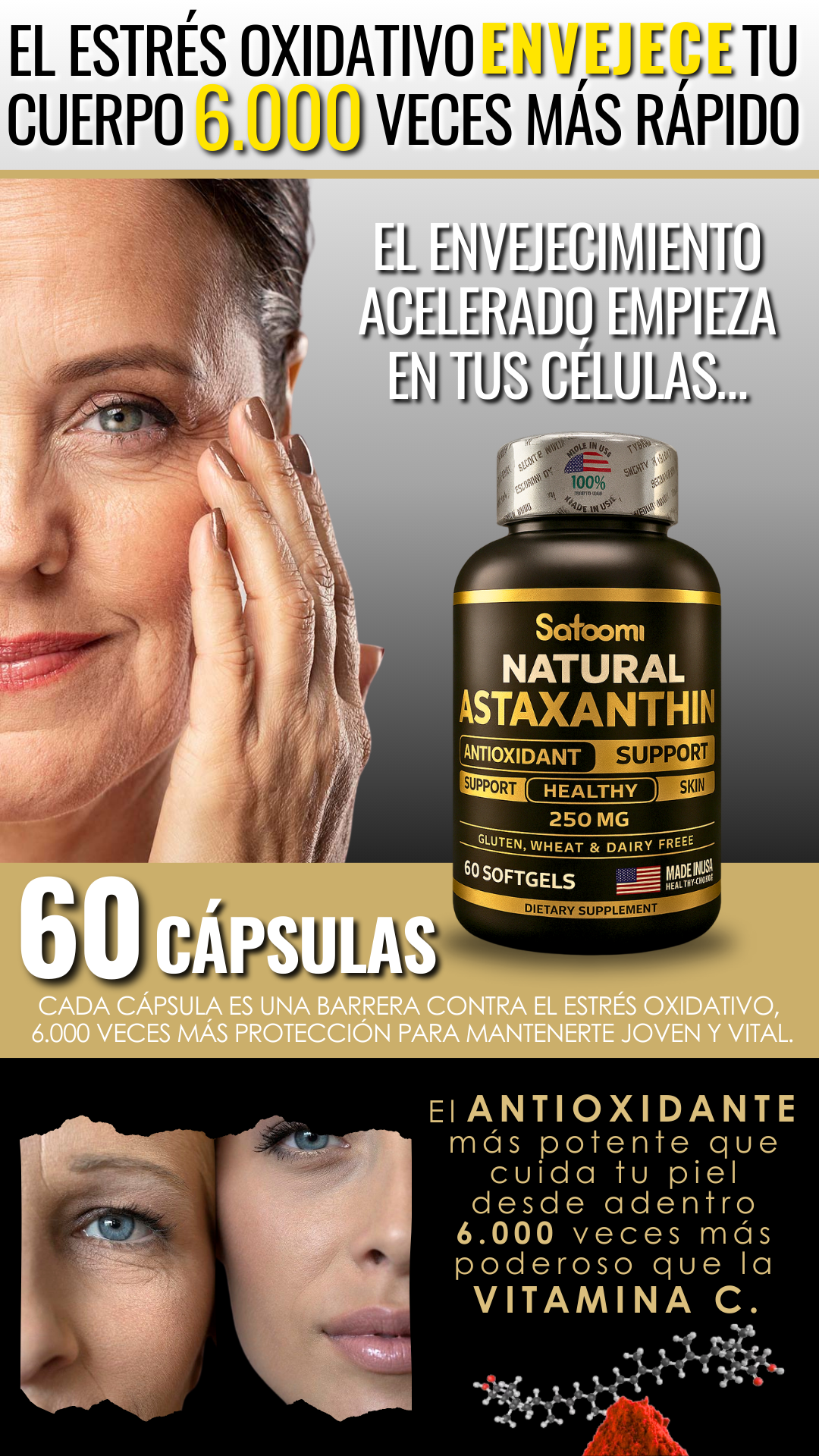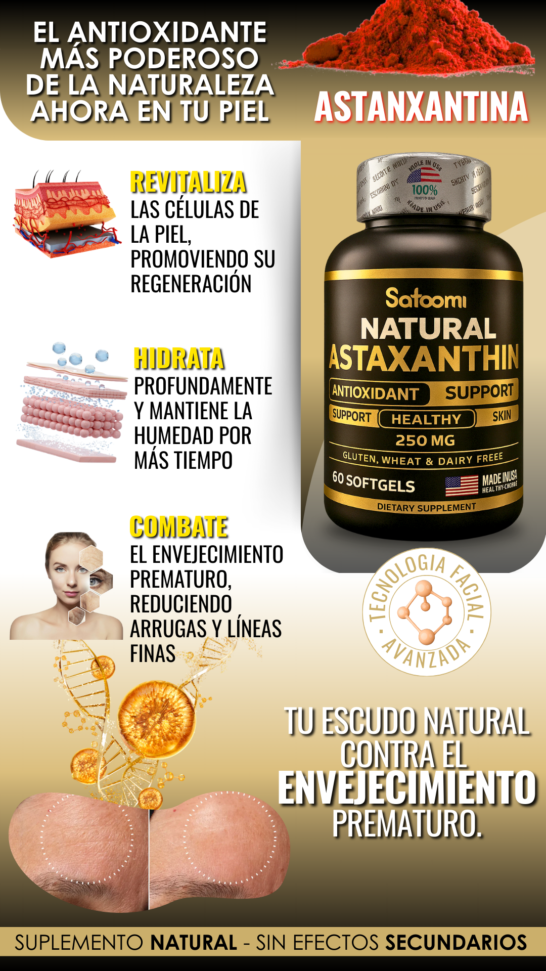 La Astaxantina es un antioxidante natural extraído de microalgas, conocido como uno de los más potentes del mundo. Su principal diferencia es que tiene un efecto antioxidante 6.000 veces más fuerte que la vitamina C, lo que ayuda a combatir el envejecimiento prematuro, proteger la piel, los ojos y mejorar la energía celular