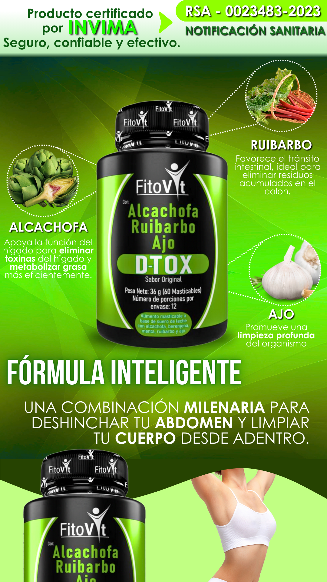 D-TOX Fitovit es un suplemento natural en cápsulas formulado con ruibarbo, ajo y alcachofa, diseñado para desintoxicar el organismo, mejorar la digestión, reducir la hinchazón y apoyar la pérdida de peso de manera segura y natural.