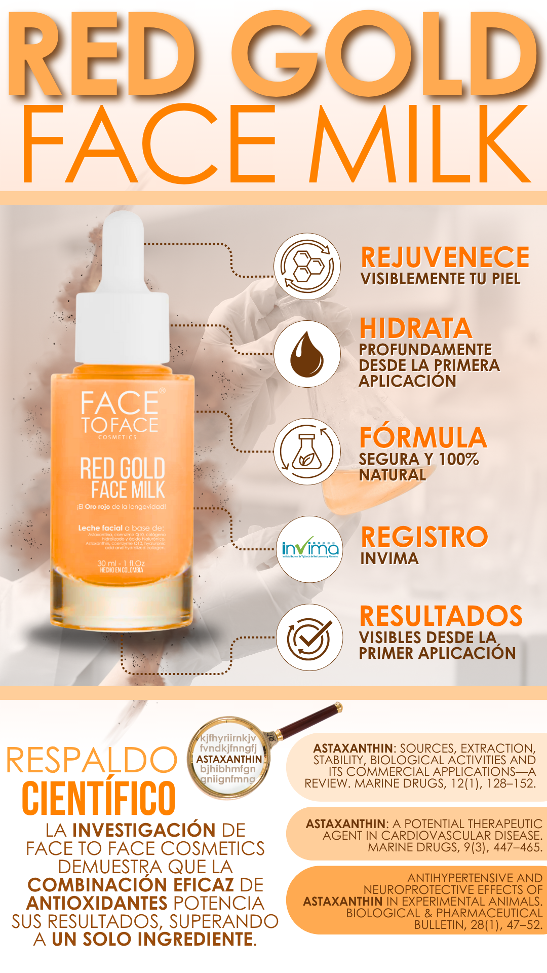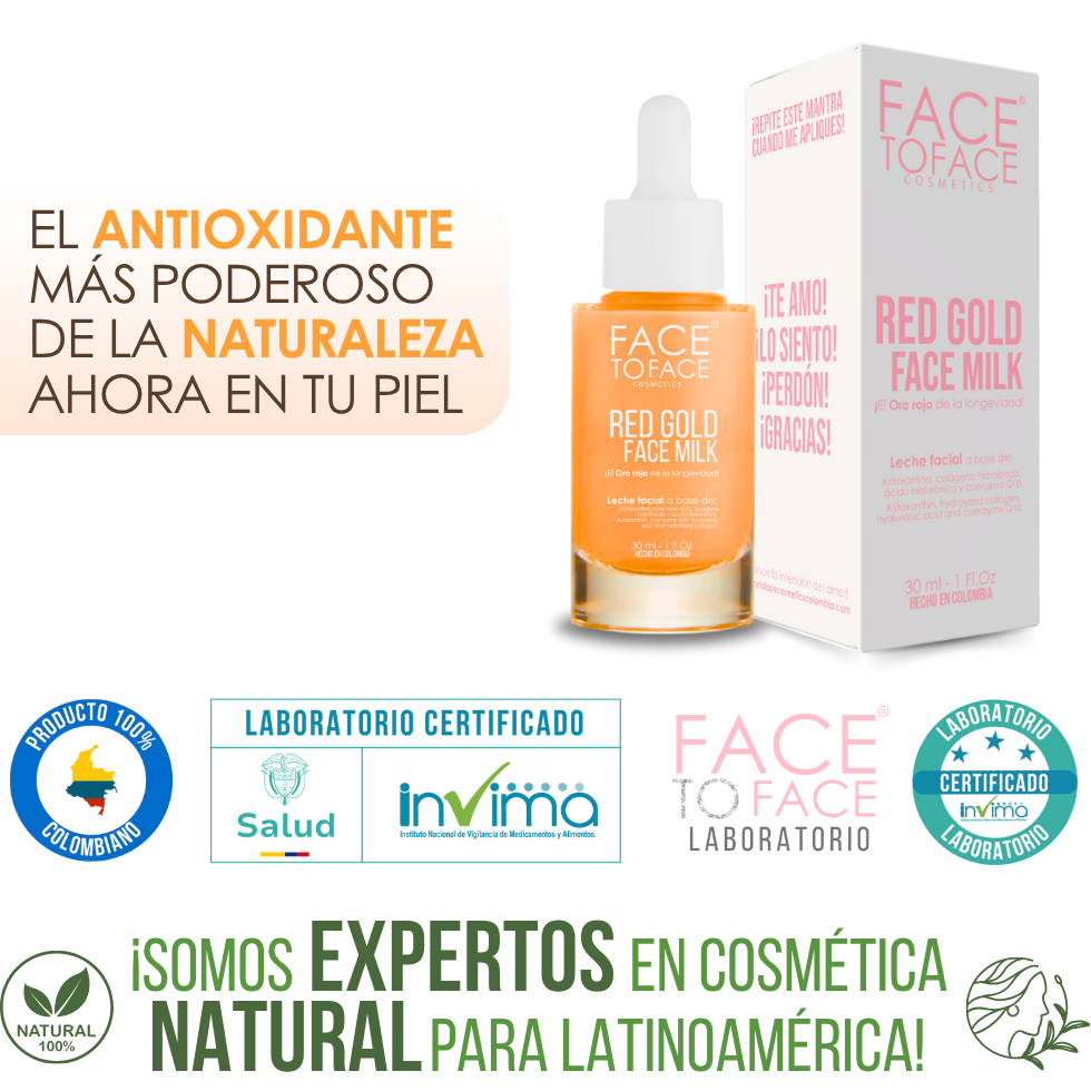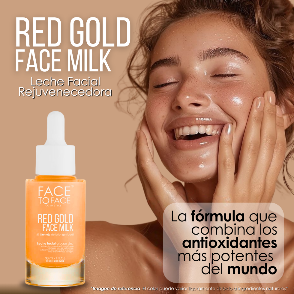 Red Gold Face Milk es apto para todo tipo de piel: seca, grasa y mixta. Su fórmula con Astaxantina, Coenzima Q10 y Ácido Hialurónico hidrata profundamente sin obstruir los poros. Además, no contiene alcohol ni parabenos, evitando irritaciones en pieles sensibles.